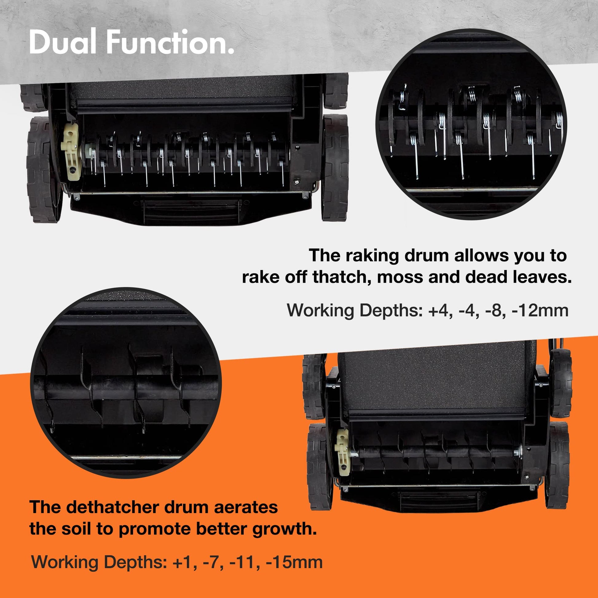 This 2-in-1 electric lawn scarifier and aerator is designed to effectively remove thatch, moss, and debris while improving soil aeration for healthier grass growth and better drainage. Powered by a robust 1800W motor, it delivers efficient performance with a wide 38cm working width, allowing you to cover larger areas quickly and reduce overall maintenance time. The unit features five adjustable working depths ranging from -12mm to +6mm, making it suitable for both light raking and deeper scarifying depending on your lawn’s condition. Equipped with interchangeable rollers, it easily switches between scarifying and raking functions without the need for tools, providing versatile lawn care throughout the year. The large 55L collection box minimizes interruptions by collecting debris as you work, while the 10-meter power cable offers extended reach across your garden. Designed for convenience, it includes a foldable, space-saving structure, ergonomic handle, and carry handle for easy transport and storage, making it a practical solution for maintaining medium to large lawns efficiently.